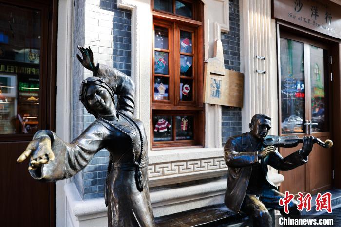 2024年12月24日,四川康定,康定情歌文化中心门口的仁钦拉姆(左)与金路易雕像。中新社记者 薛蒂 摄