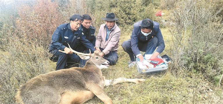 公巴白玛(右一)参与野生动物救护。受访者提供