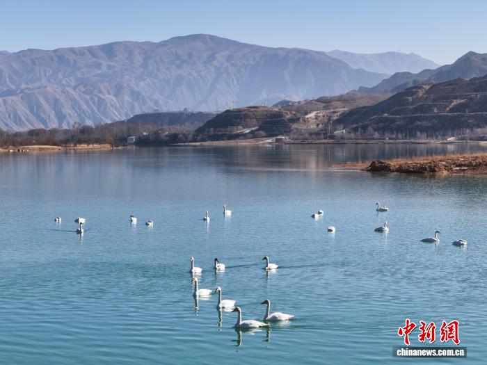 12月11日,大天鹅在青海省黄南藏族自治州尖扎县黄河流域自在游弋。随着当地生态环境持续向好,每年都会有成群的大天鹅在此越冬,冬日黄河尽显生机。中新社记者 马铭言 摄