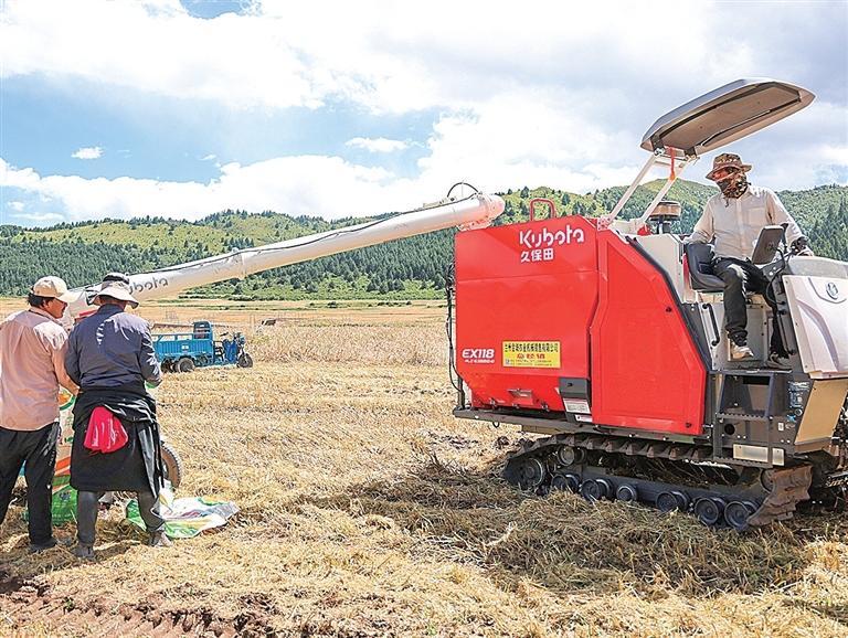 农牧民使用机械收割农作物。