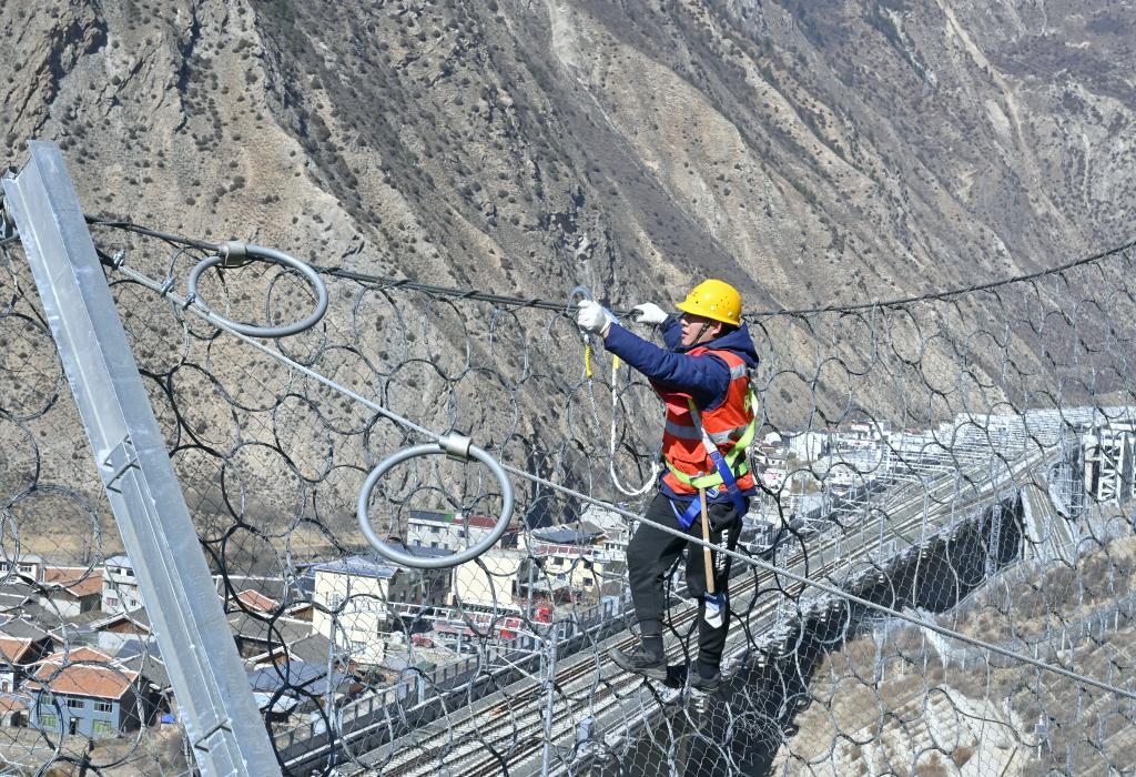 中国铁路成都局集团有限公司成都工务段班长龙文冲在攀爬检查拦石设备功能。新华社发(吕鹏程 摄)