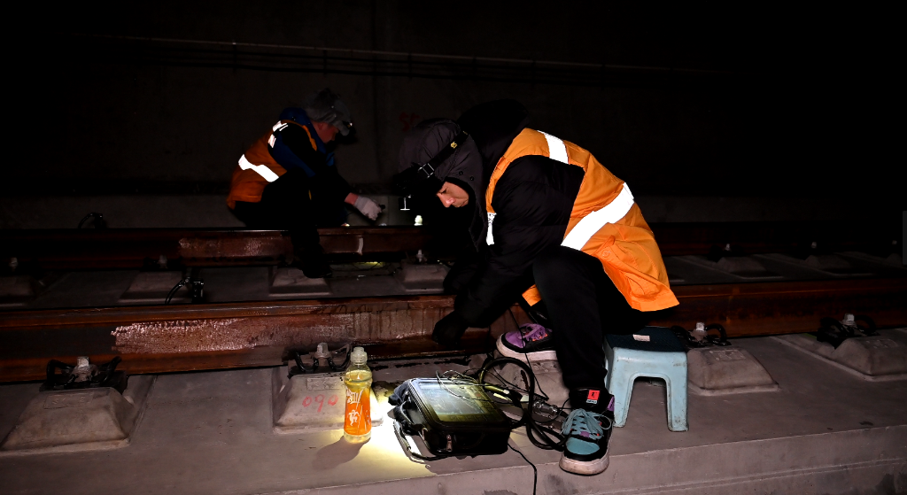 中国铁路成都局集团有限公司成都工务段无损检测员龙文峰(右)和工友正在对钢轨进行探伤。新华社发(何予哲 摄)