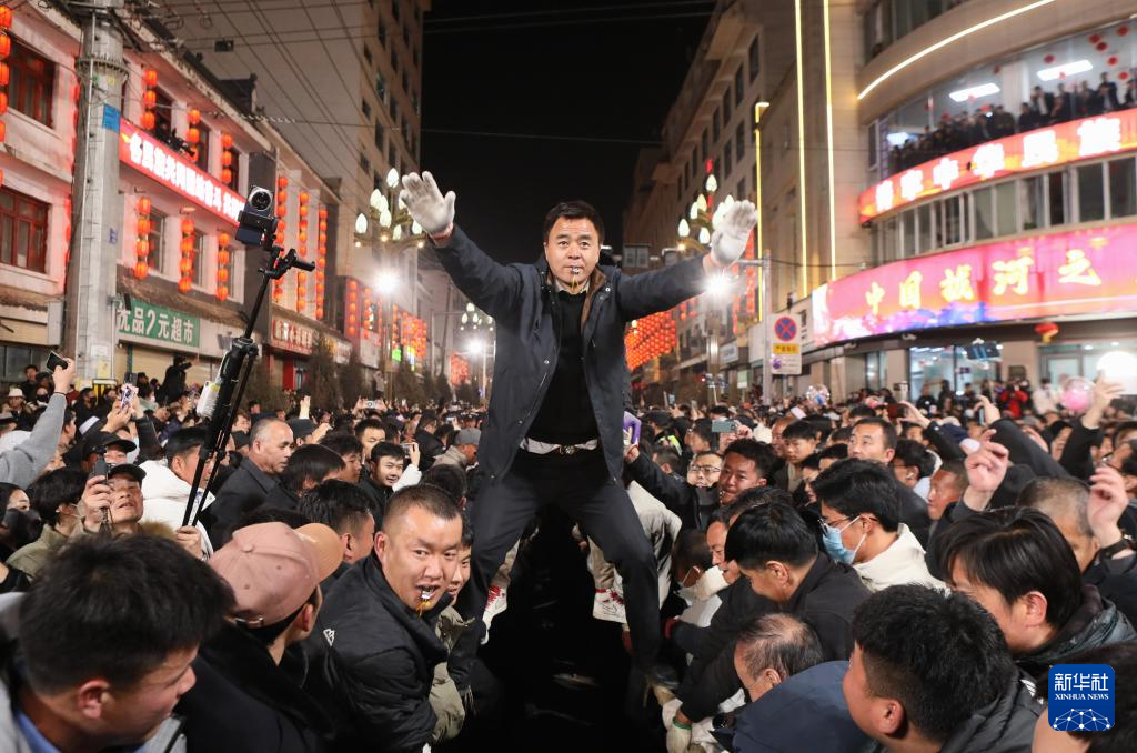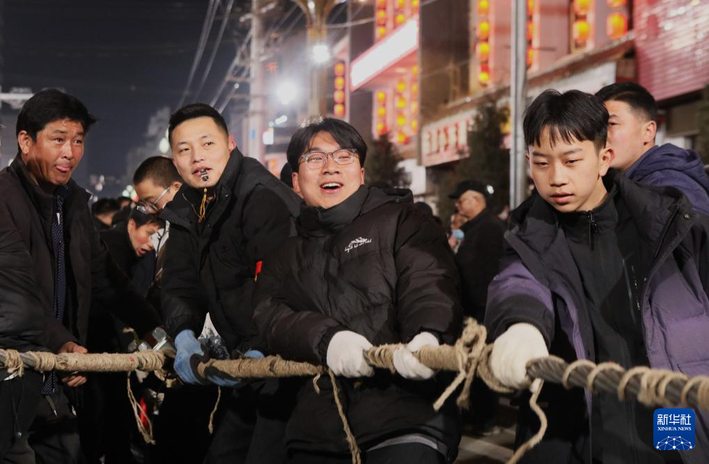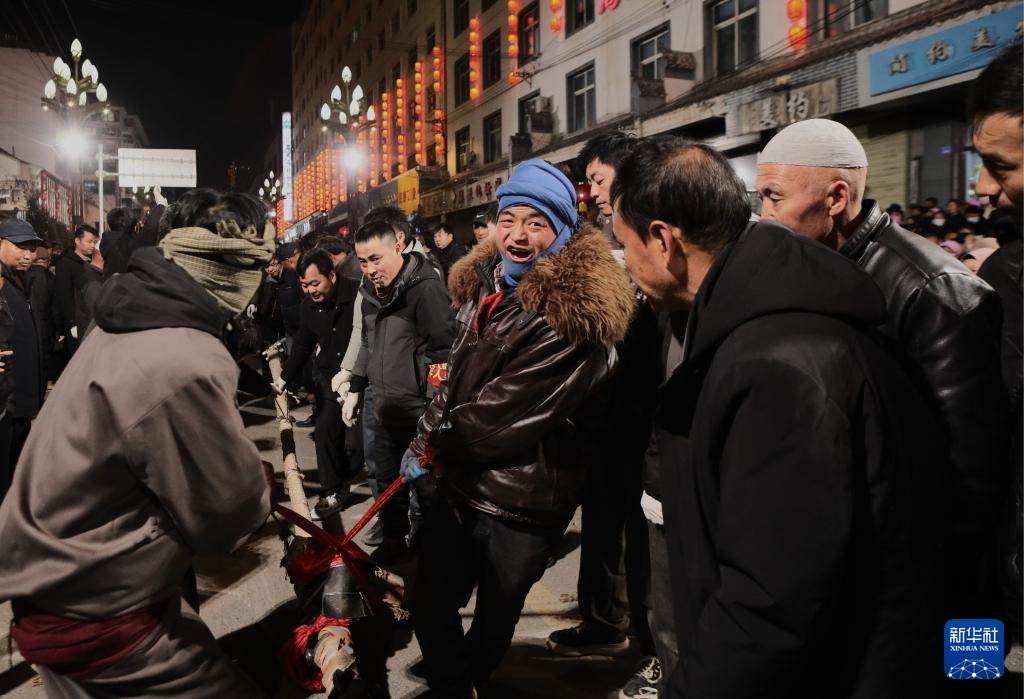 3月3日,在临潭县城关镇西大街,当地群众参加“万人扯绳”民俗活动。新华社记者 张睿 摄