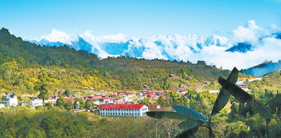 格林村与远处的雪山、近处的森林共同构成一幅生态画卷。黄家斌摄