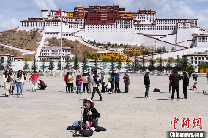 图为4月18日,一位视频博主在拉萨布达拉宫广场直播,其身后为游客在拍照“打卡”。江飞波 摄