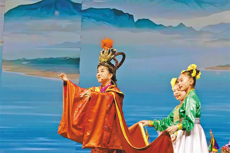 舞台中央,12岁的其美卓嘎身着锦绣华服,以清亮唱腔和灵动演绎,将文成公主的温婉坚毅展现得淋漓尽致。“当我穿上戏服、唱起‘汉藏情谊洁如璧’时,仿佛真的穿越到千年前的和亲之路。”演出结束后,小姑娘眼中闪烁着兴奋的光芒,“原来民族团结的故事,就藏在这些古老而动人的戏文里。”其父亲伦珠难掩自豪:“文成公主促进了汉藏交融,女儿能表演这个节目,用藏戏诠释民族团结,是我们全家的骄傲!”