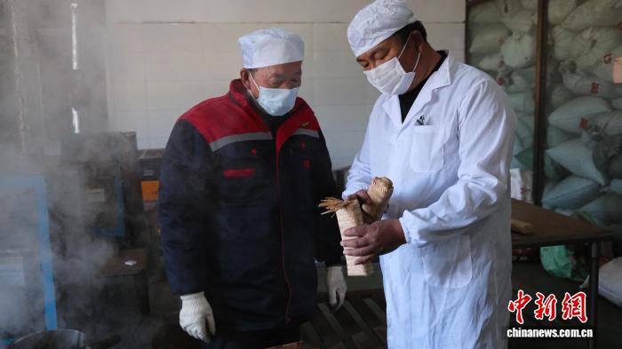 普桃(右)与茶场工人在研究茶叶的竹条包装。龙敏华 摄