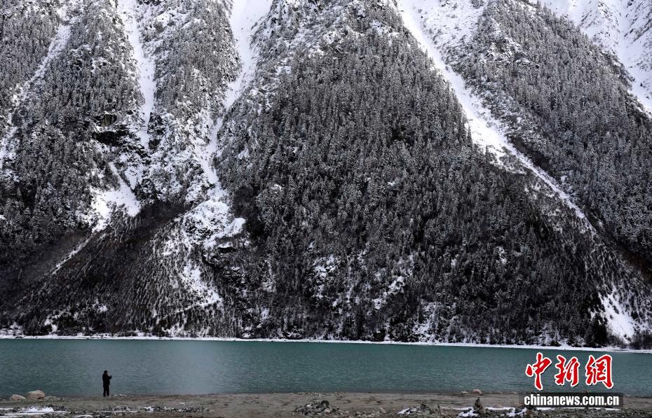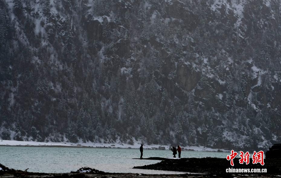 3月25日,游客拍摄西藏昌都然乌湖雪后景色。然乌湖位于西藏昌都市八宿县然乌镇境内,是山体滑坡或泥石流堵塞河道而形成的堰塞湖。雪后然乌湖湖水如翠,美如画卷。中新社记者 李林 摄