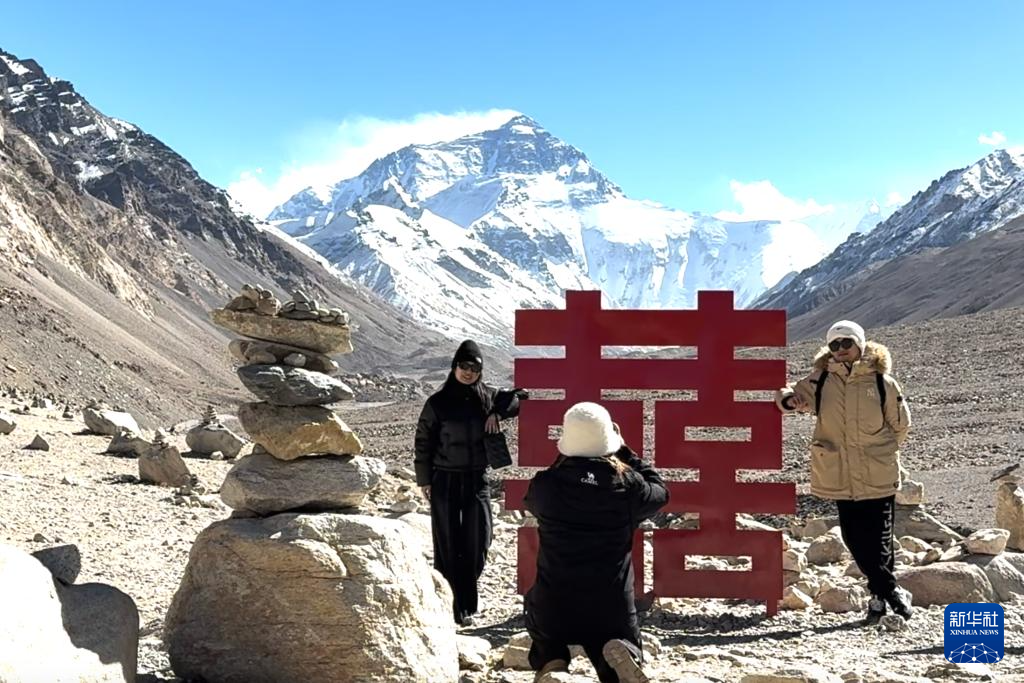 11月20日,游客在珠峰景区的“囍”字前拍照留影。新华社记者 邱星翔 摄