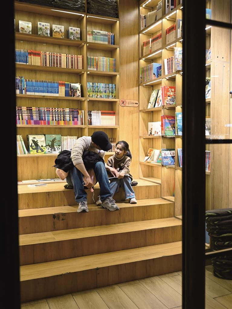 央喜书吧阅读区,读者带孩子一起看书。图/记者 秦盼