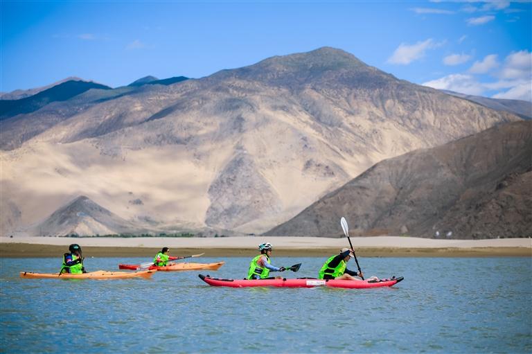 水上皮划艇项目起点位于桑耶渡口,终点是雅鲁藏布江观景台。这里江面宽8至12公里,是雅鲁藏布江的最宽处,北接国家4A级旅游景区桑耶寺,南临第一庄园朗塞岭,是绝佳的观景、拍摄地。最后的越野跑项目沿着雅鲁藏布江边进行。