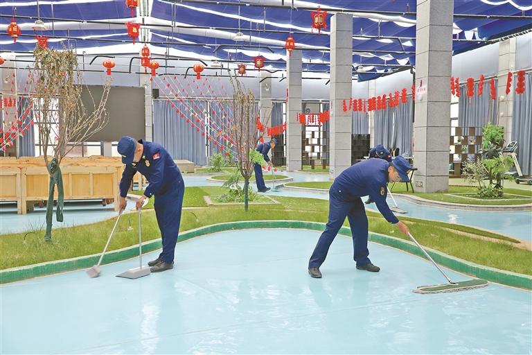 图为消防员在认真打扫卫生。记者 彭琦 摄