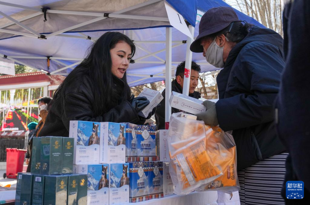 12月10日,商户在拉萨市宗角禄康公园的供销大集上向顾客介绍商品。新华社记者 晋美多吉 摄