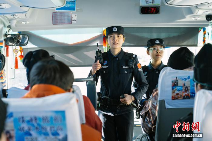 图为12月24日,西藏出入境边防检查总站珠峰边境派出所移民管理警察在前往珠峰大本营景区的巴车上向游客宣讲安全事项。蒋美灵 摄