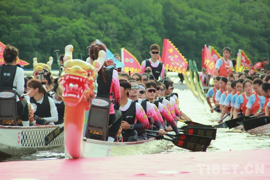 图为第十二届全国少数民族传统体育运动会龙舟项目各参赛队蓄势待发 摄影:刘莉