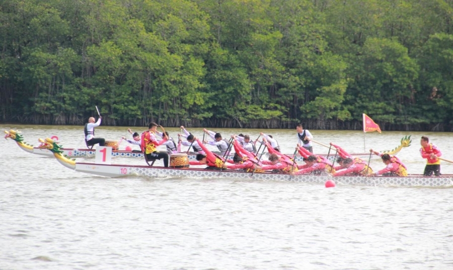 图为第十二届全国少数民族传统体育运动会龙舟项目中的海南队 摄影:刘莉