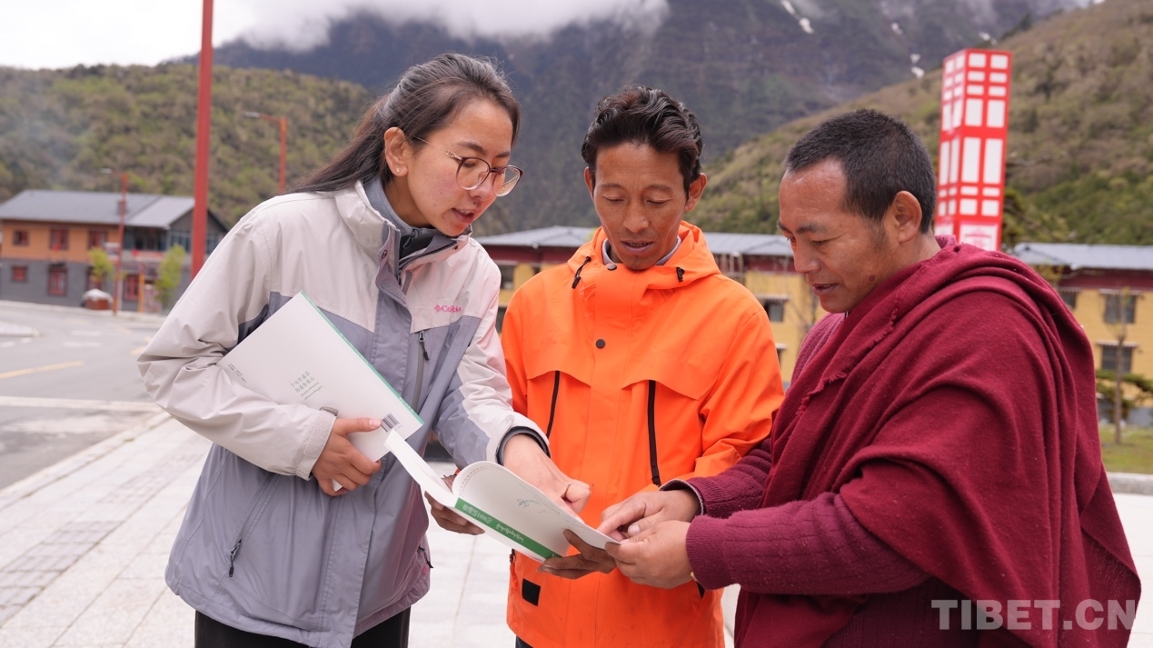 图为西藏自治区藏语委办(编译局)工作人员为玉麦乡群众指导学习方法