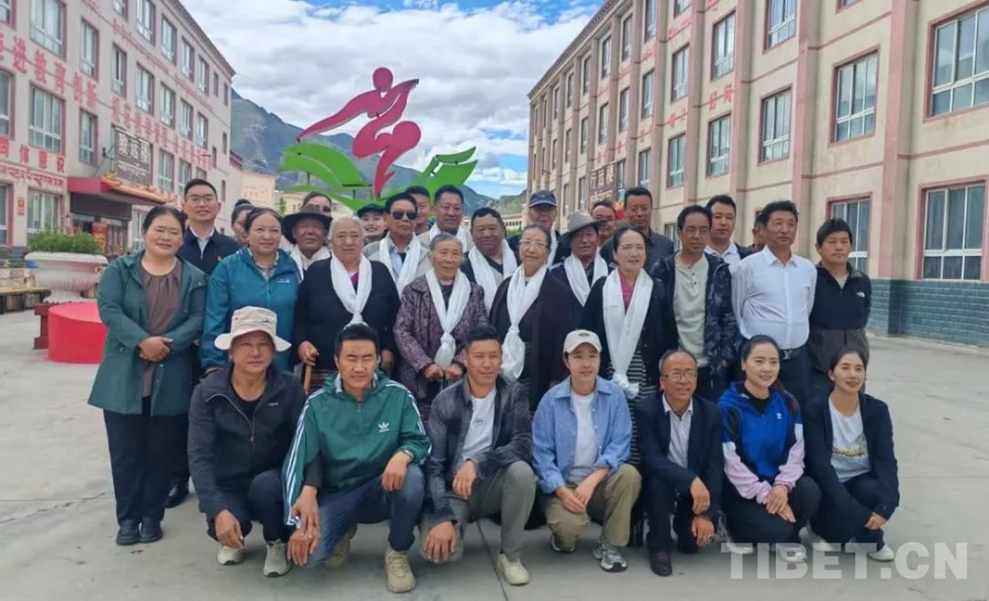 图为安置在拉萨的离退休干部们返回西藏自治区昌都市洛隆县考察参观,合影留念