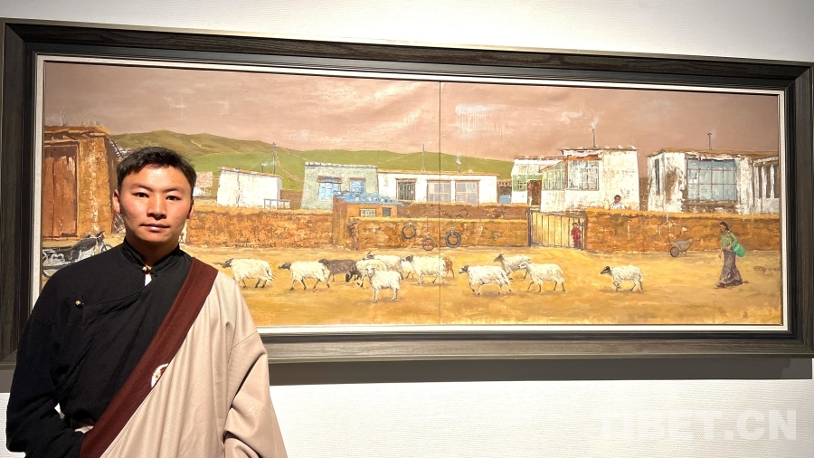 在展厅一角,身着传统藏装的西藏大学艺术学院美术系研三学生郭扎,正为观众细致讲解他的作品《高原暖阳——那曲》。他分享道:“牧区人家居住分散,我将几户零散的家庭重新组合在同一画面中,以期更完整地呈现牧区的日常图景。整幅作品以暖色调为主,寄托了我对故乡的深切思念。”更令郭扎自豪的是,他的油画《放学啦》不仅入选第十四届全国美术作品展览,更于今年七月被中国美术馆收藏。“每一次作品入选,对我都是莫大的激励。在各种展览中,我能近距离欣赏前辈艺术家的优秀作品,直观汲取其中的创作精华。”郭扎说道。