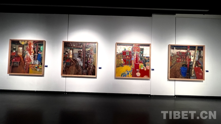 正对郭扎作品的展区,陈列着他导师曹梦的四幅画作。与郭扎描绘的户外景致不同,曹梦将视角投向那曲牧区的室内环境。这组作品色调明快、温情脉脉,营造出浓厚的家庭氛围。西藏大学艺术学院副教授曹梦表示:“大家在创作时,总会从打动自己的题材入手。虽然我在西藏工作已有十六年,但对家乡与亲人的思念始终如一。我画的虽不是自己的家,却愿意把别人的家当作自己的家去体会、去表达。这四幅画色彩明艳,给人传递一种愉悦感觉,也意图展现牧区新生活中幸福洋溢的面貌。”