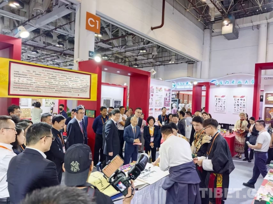 图为西藏民族大学扎西曲吉参加第十六届海峡两岸(厦门)文化产业博览交易会,现场书写“团结统一”的汉藏双语书法作品并做讲解
