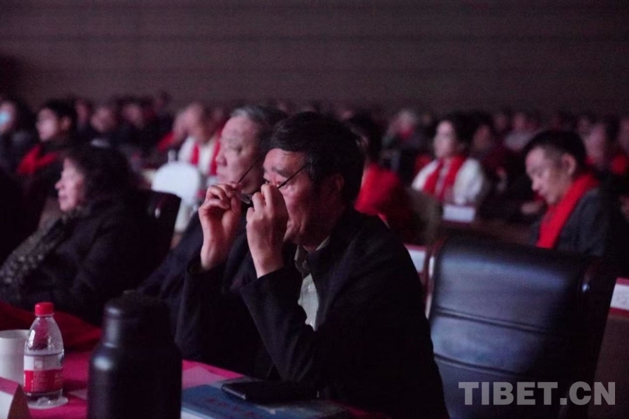 图为在首映式观影过程中,援藏干部动情落泪 制片方供图