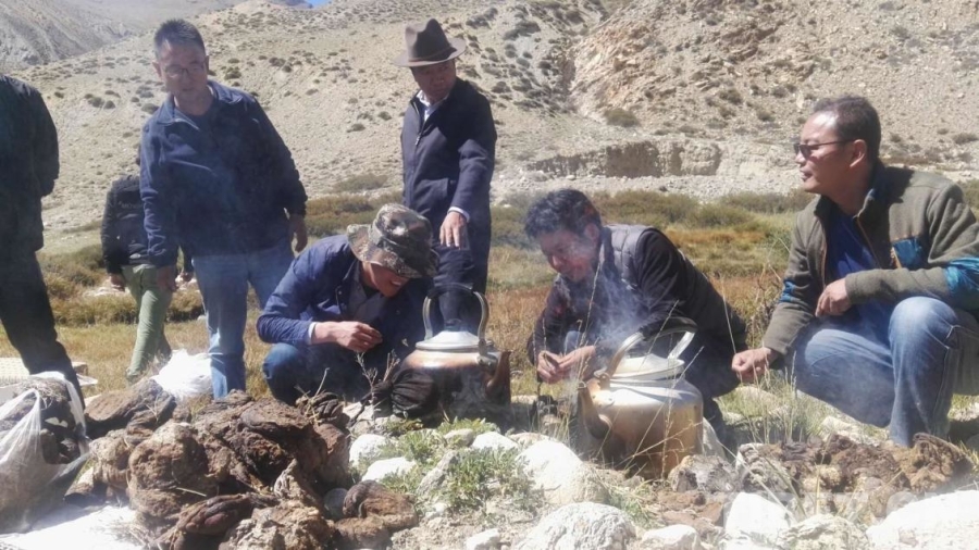 图为曾佑志与同事到西藏阿里地区边境调研,路途遥远,只能中途在路边捡牛粪烧水做饭 受访者供图