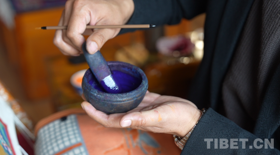 画师在蘸取颜料绘制唐卡 摄影:张艺彤