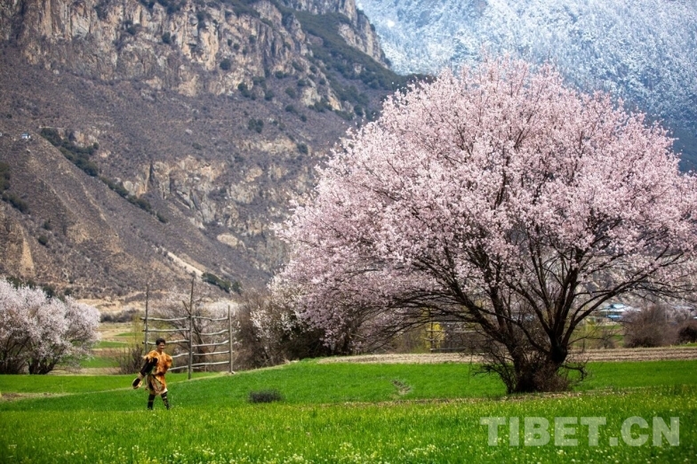 身着嘉黎特色服饰的姑娘,手捧桃枝,在雪山花海的映衬下,喜迎远方来客。