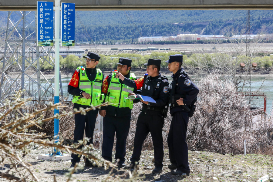 中国西藏网讯 4月2日,2026年林芝第二十三届桃花旅游文化节米林分会场活动在米林市扎西绕登镇彩门云上桃源景区开幕,活动现场紧邻拉林铁路。为确保铁路运输安全畅通,拉萨铁路公安处民警深入铁路沿线开展安全巡查,排查安全隐患,强化线路防控,用坚守守护平安,为春日盛会保驾护航。(中国西藏网 通讯员/黄飞)