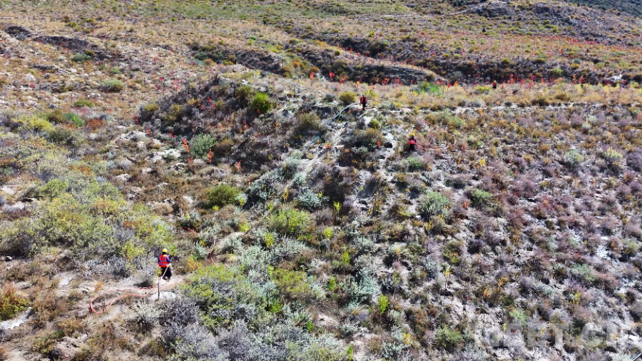 巴宜区附近山坡上,工作人员正细心浇水、打理生态区域,用心守护“桃花城”的每一抹新绿。