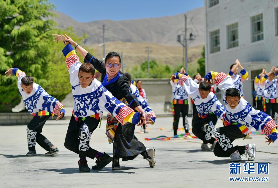 在西藏山南市第一高级中学,来自湖北省武汉市旅游学校的援藏教师马丹(左三)指导学生练习校园啦啦操(2019年5月8日摄)。[详细]