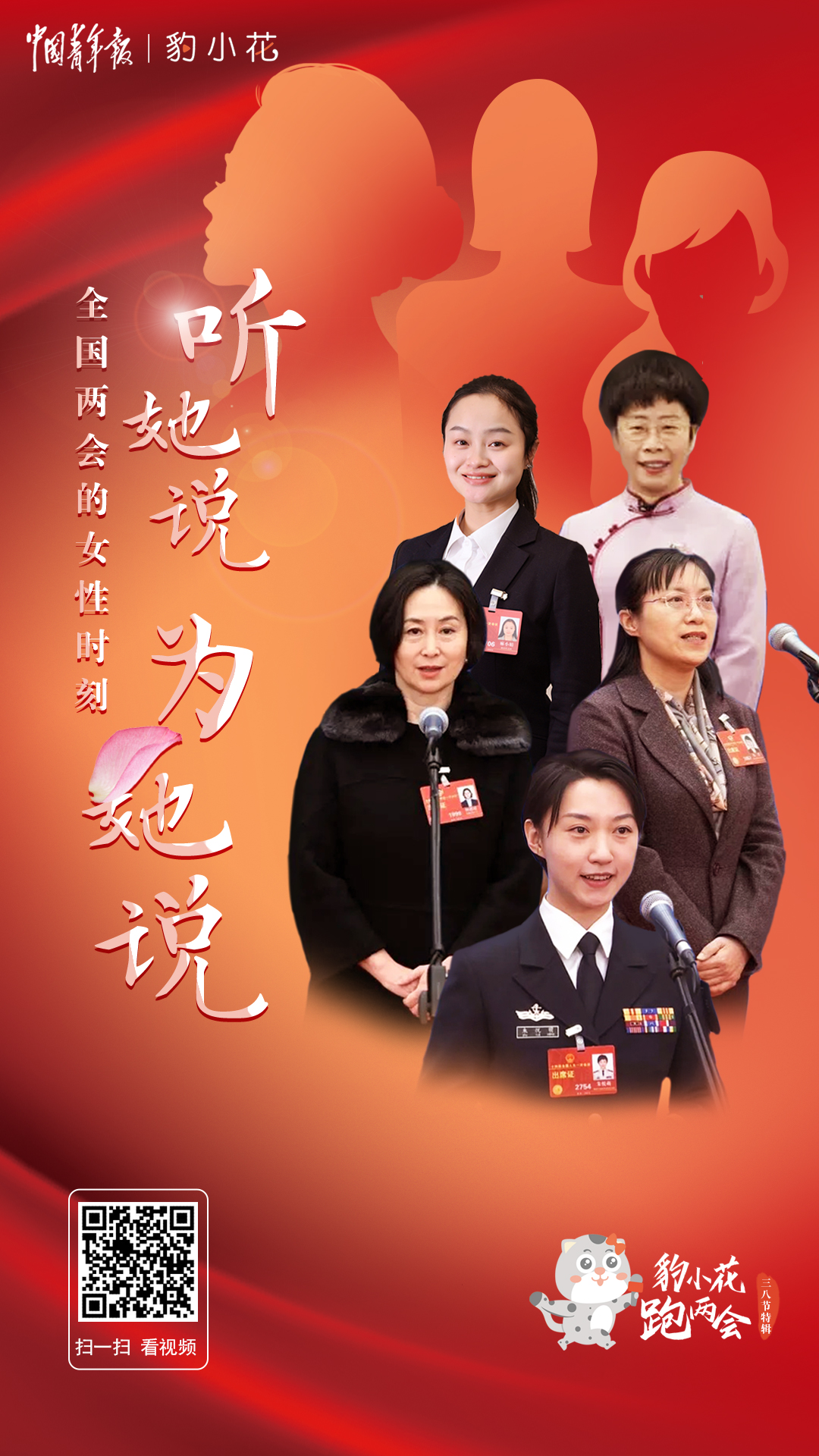 在今年全国两会上,一位位女性代表委员履职建言,贡献“她的声音”:95后代表朱悦萌把青春和梦想融入祖国的航母事业,她说,“舰艏行处是长城,国家利益所至,海军航迹必达!”水庆霞代表说起中国女足的热爱与坚持,铿锵玫瑰永不言败。中国残疾人联合会理事杨洋委员说:“被光照耀的我们也想成为光照耀别人。”……同时,也有不少代表委员在为女性群体的利益发声。豹小花跑两会今天推出三八国际妇女节特辑,和你一起关注全国两会上的“女性时刻”。