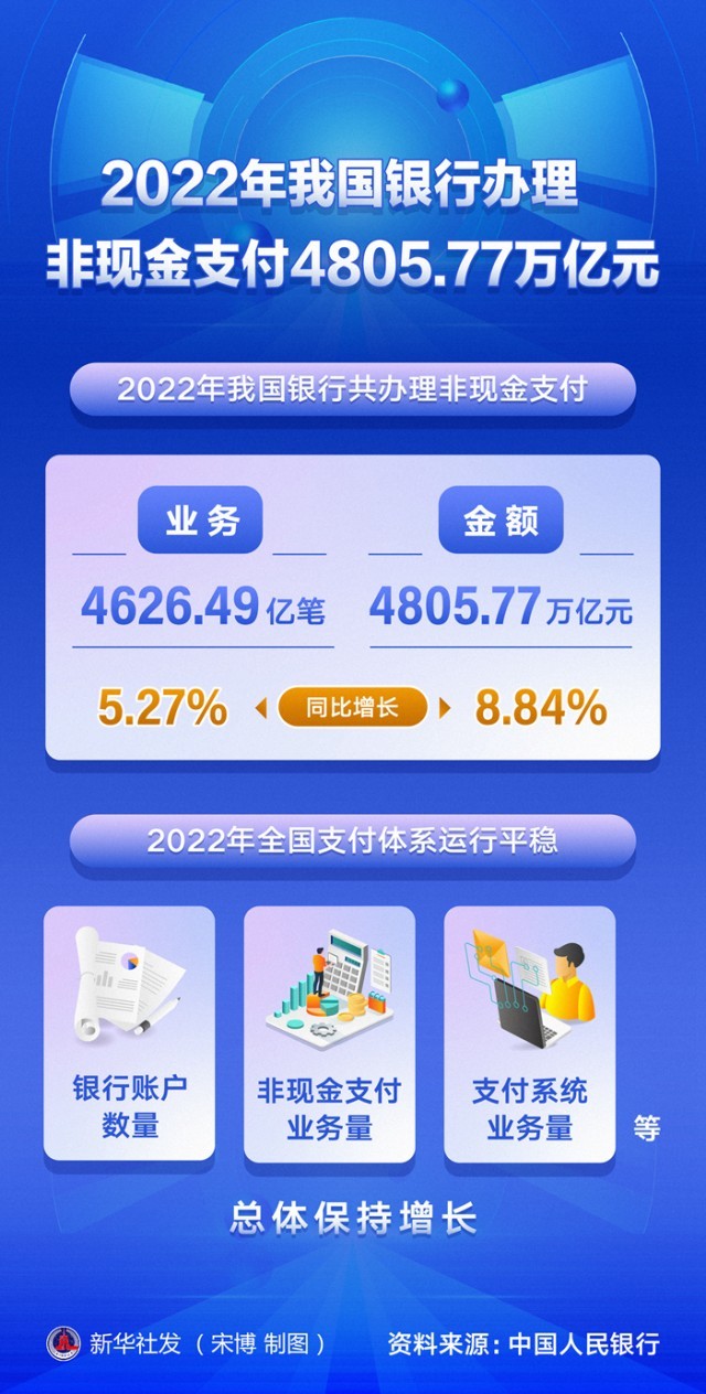 人民银行相关人士介绍,2022年全国支付体系运行平稳,银行账户数量、非现金支付业务量、支付系统业务量等总体保持增长。