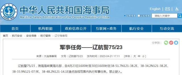 大连海事局发布航行警告,4月23日16时至30日16时,渤海海峡黄海北部执行军事任务,禁止驶入。