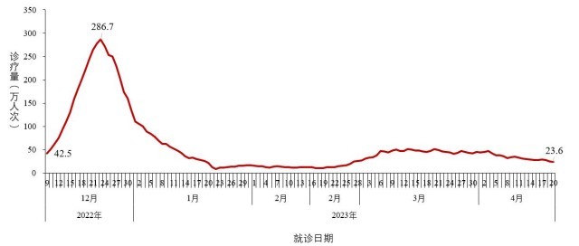 (一)总体就诊人数结果。全国(不含港澳台)发热门诊(诊室)就诊人数于2022年12月23日达到峰值286.7万人次,随后连续下降;2023年1月23日后就诊人数呈现低位波动,约6周(2月24日-4月6日)的波动增加及平台波动后,近2周(4月7日-4月20日)呈下降趋势,4月20日为23.6万人次,较峰值下降了91.8%(图2-1)。