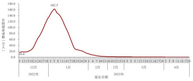 (一)在院新冠病毒感染者结果。全国在院新冠病毒感染者于2023年1月5日达到峰值162.5万人,随后持续下降;4月20日下降至3929例,较峰值减少了99.8%(图3-1)。