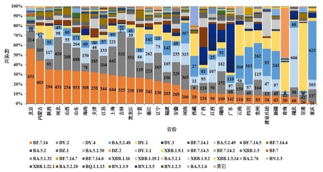 2.图中标记的数字按顺序分别为BF.7.14、DY.2、DY.4、BA.5.2.48、BA.5.2.49和DY.1进化分支有效基因组序列数量;
