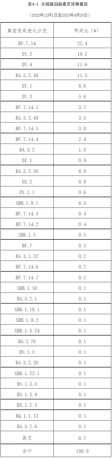 (二)12月以来本土病例病毒变异株监测情况。2022年12月1日至2023年4月20日,全国共报送32993例本土病例新冠病毒基因组有效序列,均为奥密克戎变异株,涵盖117个进化分支。主要流行株为BA.5.2及其亚分支(构成比64.3%)和BF.7及其亚分支(构成比33.0%)等。其中,BA.5.2及其亚分支包括DY.2(19.2%)、DY.4(11.6%)、BA.5.2.48(11.3%)、DY.1(8.6%)、DY.3(5.6%)和BA.5.2.49(3.5%)等;BF.7及其亚分支包括BF.7.14(22.4%)、BF.7.14.1(3.7%)、BF.7.14.5(3.0%)、BF.7.14.4(2.4%)、BF.7.14.3(0.4%)和BF.7.14.2(0.3%)等(表4-1)。共监测到本土重点关注变异株603例,其中,4例BQ.1、4例BQ.1.1、19例BQ.1.1.13、1例BQ.1.1.17、1例BQ.1.1.18、1例BQ.1.1.35、1例BQ.1.1.38、1例BQ.1.1.46、1例BQ.1.1.53、2例BQ.1.1.66、1例BQ.1.1.69、8例BQ.1.2、1例BQ.1.23、2例BQ.1.8、2例CH.1.1、3例CH.1.1.1、1例CH.1.1.11、1例DT.2、1例EA.1、2例EG.1、3例EL.1、7例EM.1、1例EU.1.1、2例FB.1、3例FE.1、1例XBB、4例XBB.1、2例XBB.1.11.1、1例XBB.1.12、4例XBB.1.15、42例XBB.1.16、5例XBB.1.16.1、16例XBB.1.17.1、37例XBB.1.19.1、2例XBB.1.22、22例XBB.1.22.1、1例XBB.1.23、5例XBB.1.24、1例XBB.1.4、109例XBB.1.5、2例XBB.1.5.11、9例XBB.1.5.12、2例XBB.1.5.15、7例XBB.1.5.23、35例XBB.1.5.24、1例XBB.1.5.28、1例XBB.1.5.32、1例XBB.1.5.36、1例XBB.1.5.5、2例XBB.1.5.7、2例XBB.1.9、163例XBB.1.9.1、35例XBB.1.9.2、1例XBB.1.9.3、1例XBB.1.9.5、11例XBB.2.3、1例XBB.2.3.2、1例XBB.2.4和2例XBB.3。