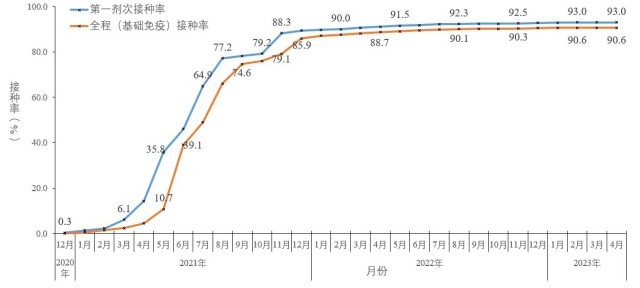 截至2023年4月20日,31个省(自治区、直辖市)和新疆生产建设兵团累计报告接种新冠病毒疫苗349443.2万剂次(图5-1)。接种总人数131048.0万人,完成全程接种127708.4万人,完成第一剂次加强免疫接种82783.9万人。全人群第一剂次、全程接种覆盖比例分别达到93.0%和90.6%(图5-2)。60岁以上老年人累计报告接种新冠病毒疫苗68083.7万剂次,接种总人数24169.3万人,完成全程接种23036.1万人,完成第一剂次加强免疫接种19318.9万人。