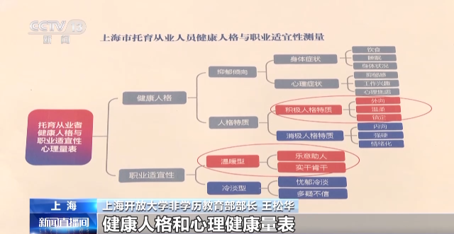 上海开放大学非学历教育部部长 王松华:我们用专门研发的健康人格和心理健康量表,从两个维度八个方面,用92道题目对他们进行测量。根据测量结果,对轻度不适宜的,我们将组织心理辅导专家对他们进行辅导,对重度不适宜的人群,我们将提出劝退建议,不建议他们从事这个岗位。