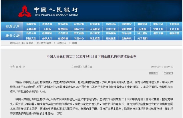 央视网消息:中国人民银行9月14日公告,决定于2023年9月15日下调金融机构存款准备金率0.25个百分点(不含已执行5%存款准备金率的金融机构)。本次下调后,金融机构加权平均存款准备金率约为7.4%。