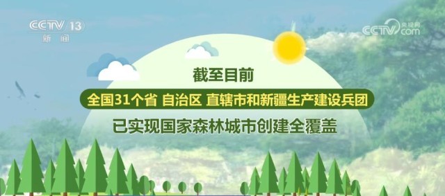 截至目前,全国31个省(自治区、直辖市)和新疆生产建设兵团已实现国家森林城市创建全覆盖,城市建成区绿化覆盖率由十年前的39.22%提高到现在的42.69%,城市人均公园绿地面积由十年前的11.8平方米提高到现在的15.29平方米。全国广泛开展乡村绿化美化行动,建设各具特色的绿色村庄,认定国家森林乡村7586个,村庄绿化覆盖率达到32.01%。