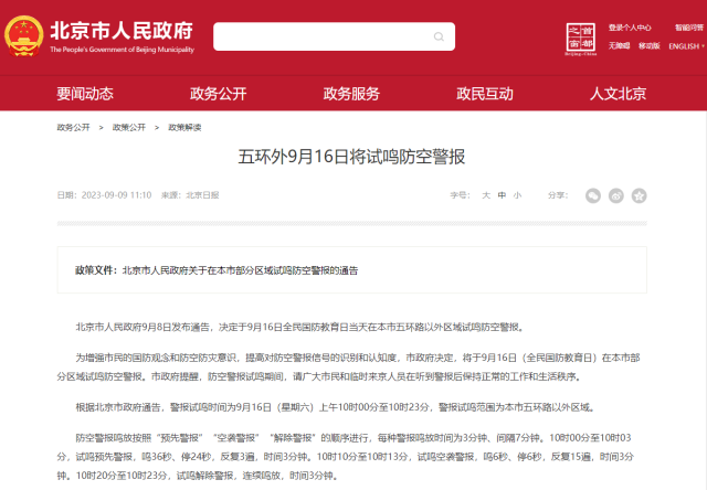 北京市人民政府9月8日发布通告,决定于9月16日全民国防教育日当天在本市五环路以外区域试鸣防空警报。