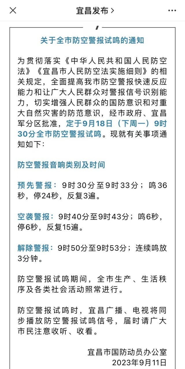 据宜昌市国防动员办公室通知,宜昌市定于9月18日9时30分全市防空警报试鸣。