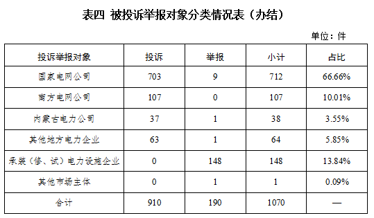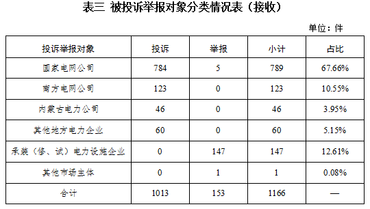从被投诉举报对象看,供电企业921件、占投诉举报总数的86.07%,其中国家电网公司712件、占比66.66%,南方电网公司107件、占比10.01%,内蒙古电力公司38件、占比3.55%,其他地方电力企业64件、占比5.85%;承装(修、试)电力设施企业148件、占比13.84%;其他市场主体1件、占比0.09%。