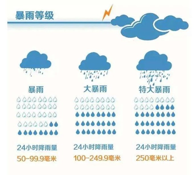 如果24小时降水量大于等于100毫米,那便达到了“大暴雨”等级;如果24小时降水量大于等于250毫米,就达到了“特大暴雨”等级。
