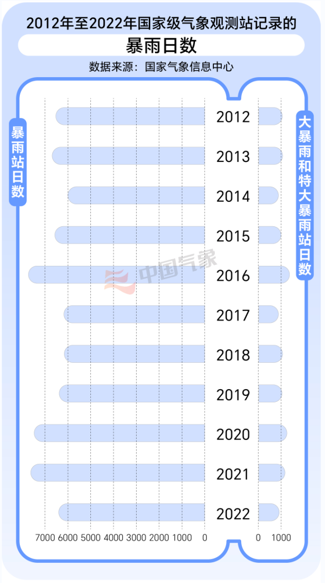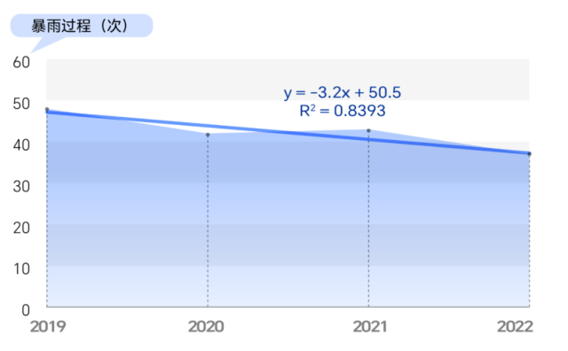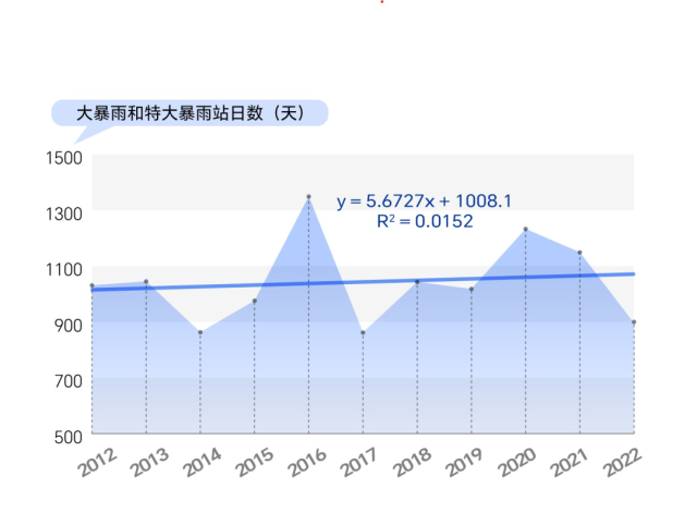 数据统计显示,2012年至2022年,我国暴雨站日数有明显的增加趋势。这意味着,2012年到2022年,我国暴雨天气过程的持续时间或影响范围有增加(扩大)的趋势。