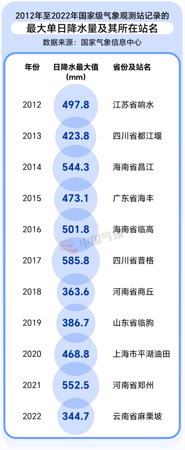 那么,近年来的单日最大降水量又是如何变化的呢?据国家气象信息中心数据显示,2012年至2022年,我国日降水量最大值分别出现在江苏响水、四川都江堰、海南昌江、广东海丰、海南临高、四川普格、山东临朐、上海平湖油田、河南郑州、云南麻栗坡。