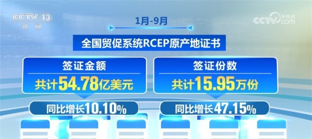 1月—9月,全国贸促系统RCEP原产地证书签证金额共计54.78亿美元,同比增长10.10%;签证份数共计15.95万份,同比增长47.15%。